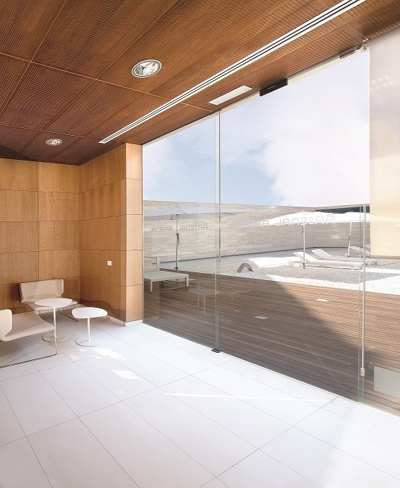 La entrada principal con sistema de esclusa, cuenta con dos puertas con sistema antipánico sin perfilería vertical. El sistema de esclusa está considerado como la mejor solución para evitar corrientes de aire, y el sistema antipánico permite con sus hojas abatibles, ofrecer la mayor seguridad sin renunciar a la estética que aporta la transparencia del vidrio sin perfilería vertical.